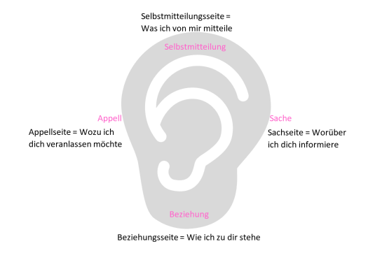 Wenn wir das Kommunikationsmodell von Schulz von Thun im Kopf haben, gibt es jeweils vier Aspekte in einer Kommunikation. Es gibt also vier Seiten, wie wir hören, und vier Seiten, wie wir reden:
